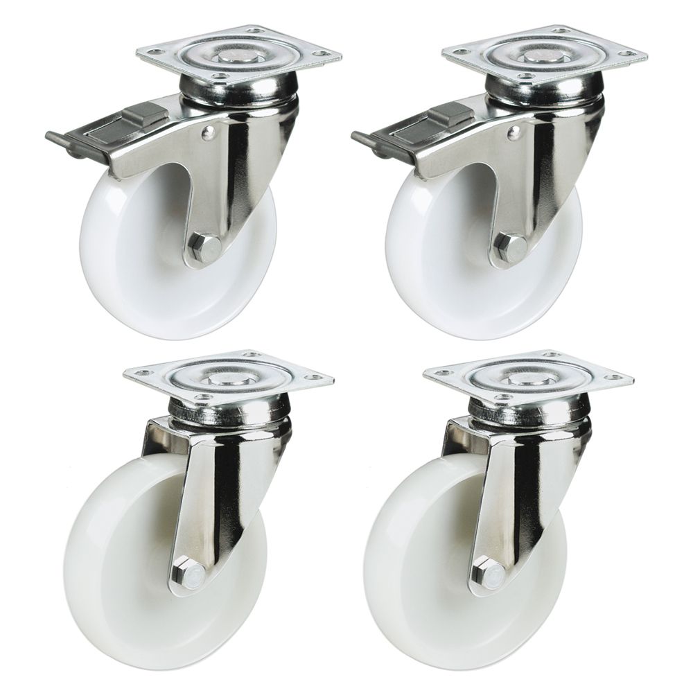 Pack 4 Ruedas Giratorias ( Ø 100mm ) – 2x Ruedas con Freno y 2x Ruedas sin Freno en Nylon Profesional · Soporte en Acero Inoxidable · Montaje Sencillo en Pletina para atornillar al Mueble · Ideal para Mobiliario Industrial de Hostelería